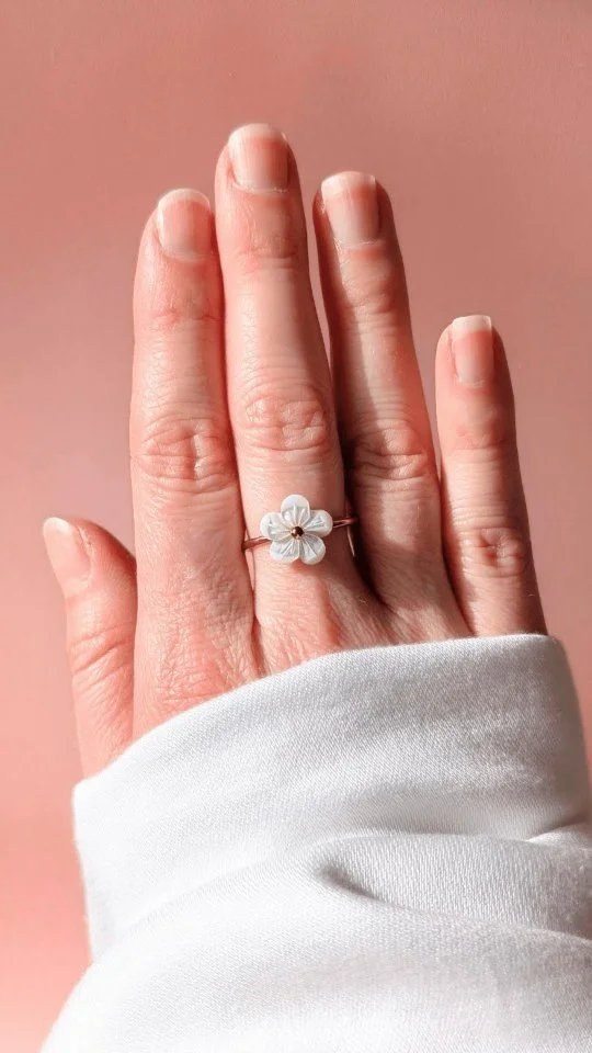 Délicate et raffinée, la bague AMANDINE s’inspire de la finesse des fleurs d’amandier et apporte une touche de douceur et d’élégance à votre style. Son design épuré met en valeur une fleur en nacre naturelle aux reflets doux et lumineux. Montée sur un anneau ajustable, elle s’adapte confortablement et se porte au quotidien. Minimaliste et féminine, elle se suffit à elle-même ou se combine facilement avec d’autres bagues pour un style plus affirmé.